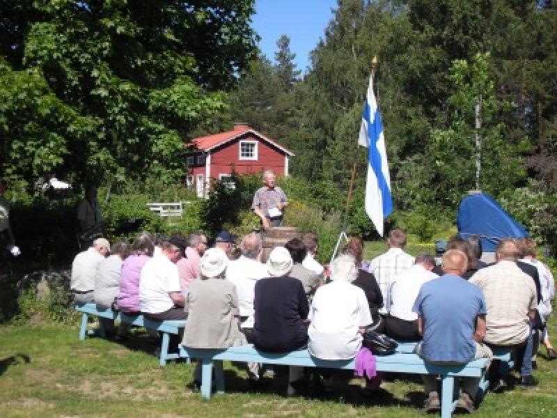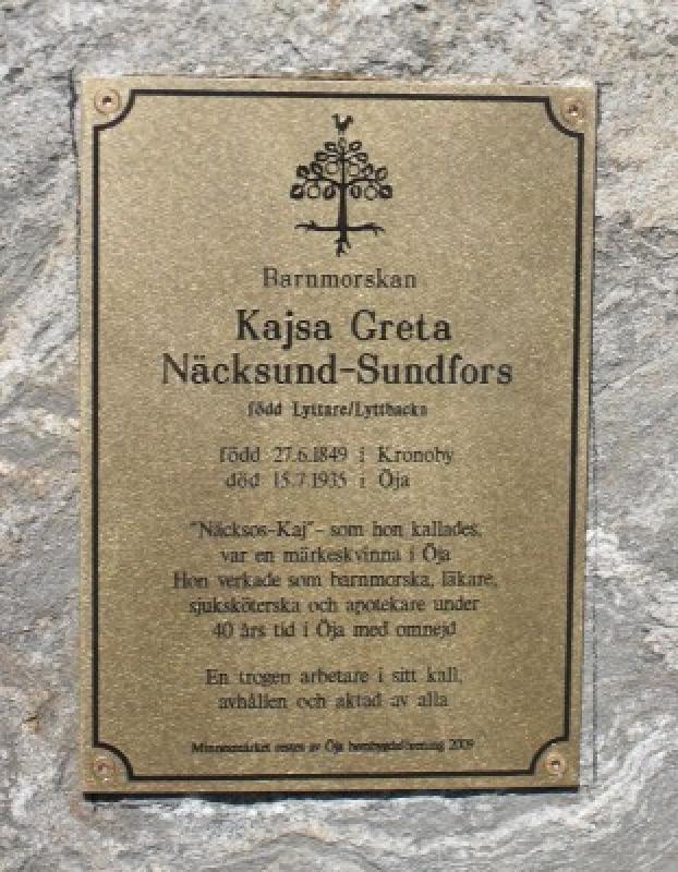 I ett härligt sommarväder avtäcktes på lördagen minnesstenen över barnmorskan Kajsa Greta Näcksund-Sundfors på Näcksund i Öja. Över etthundra personer från Öja och den omkringliggande nejden hedrade evenemanget med sin närvaro. Hembygdsföreningens ordförande Leif Sundfors hälsade välkommen varefter man sjöng Den blomstertid nu kommer. Kaj Kulla blåste en fanfar och Bjarne Sundfors höll avtäckningstalet som i korthet berörde Kajsa Greta och minnesstenen. Marskalken Carola Hästbacka, barnmorska även hon, lät täckelset falla medan Sally Sweins lade ner en blomsterbukett och Christina Lillhonga läste två välvalda dikter. En diger presentation av Kajsa Gretas liv och arbete föredrogs av Monica Röberg. Barbro Österberg presenterade barnmorskeväskan och tackade arrangörerna för festen. Modersmålets sång satte punkt för den officiella delen och festdeltagarna sökte sig till kaffebordet och skuggan undan den stekheta solen. Nämnas kan att de som medverkade i programmet var barnbarn eller barnbarnsbarn till Kajsa Greta.